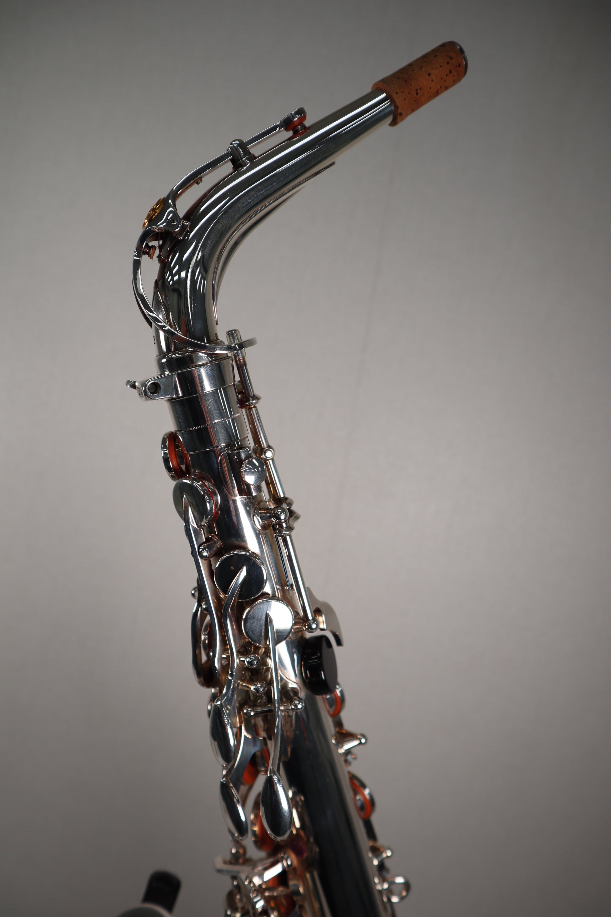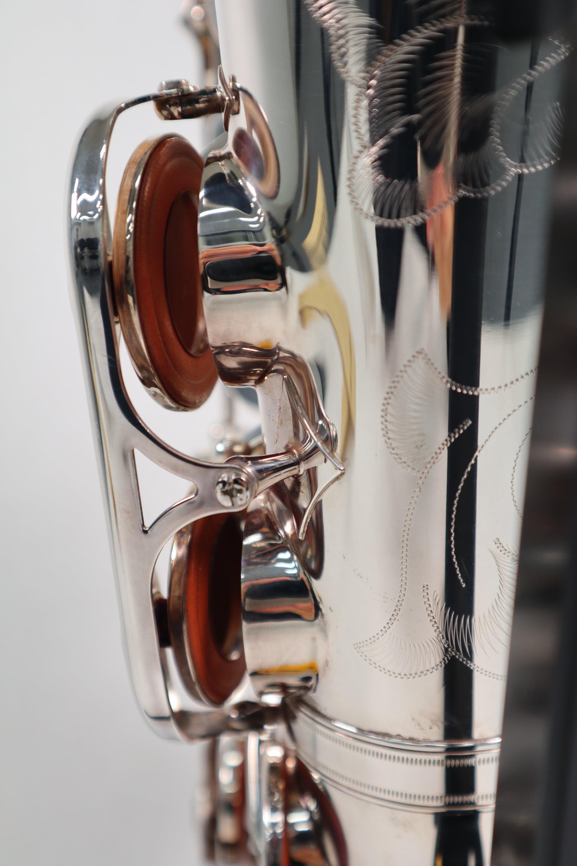 Condition is Excellent. There are signs of use, but there are no cracks in the corks/pads on the body or original 62 neck, and there are no dents. There is some silver tarnish/discoloration and small marks from normal use, but the instrument remains clean overall. No mouthpiece or ligature is included (please contact us if you need one). Included is the original case. For more details, please see the photos.