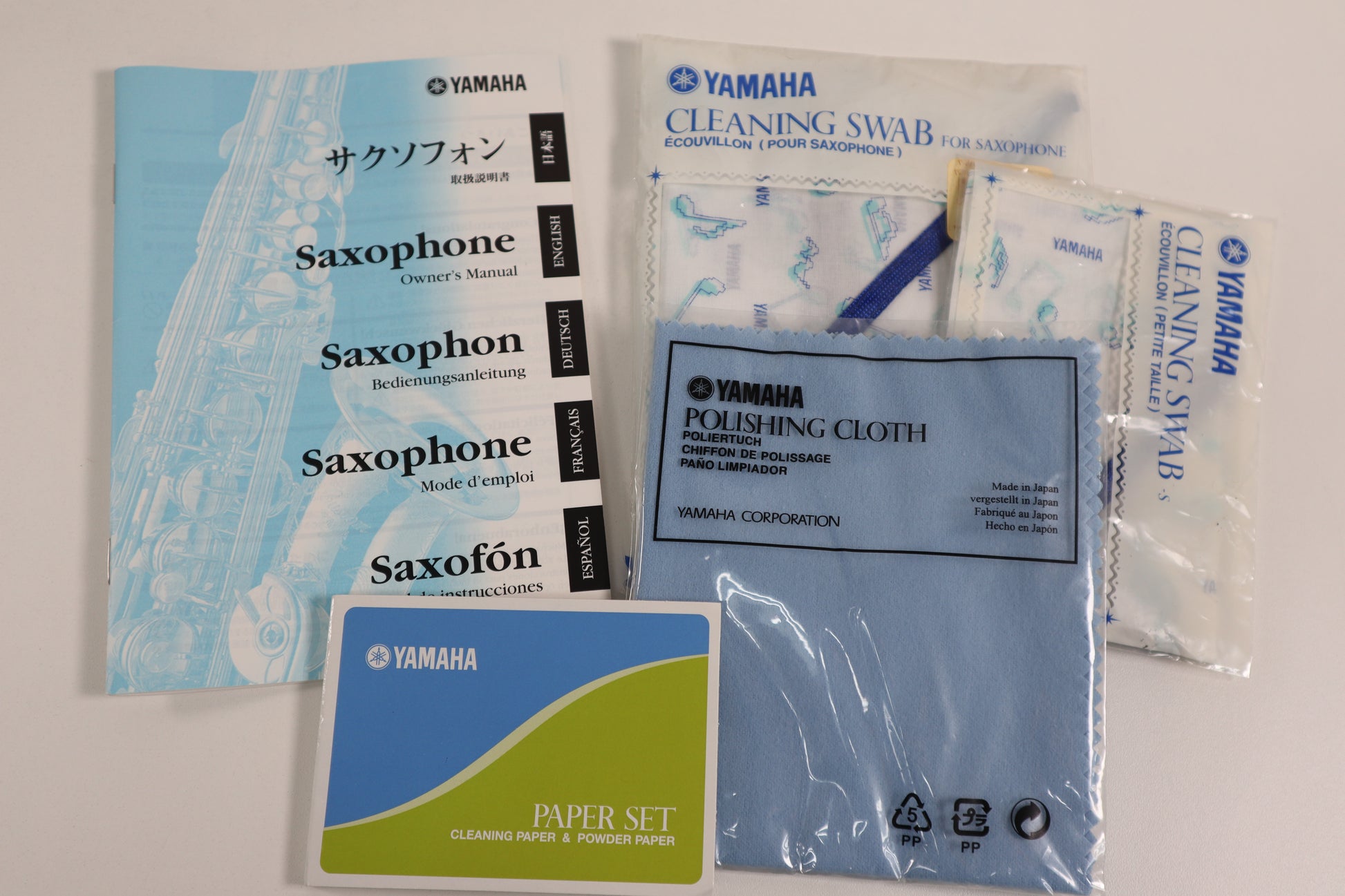 Accessories include a YAMAHA Custom 4CM mouthpiece (cleaned), the original case with key, instruction manual, YAMAHA cleaning cloth, cleaning paper, and an end cap. Please see the detailed photos for more information.